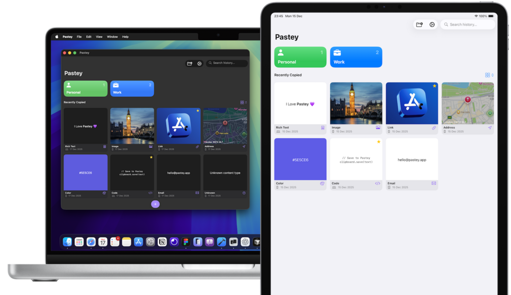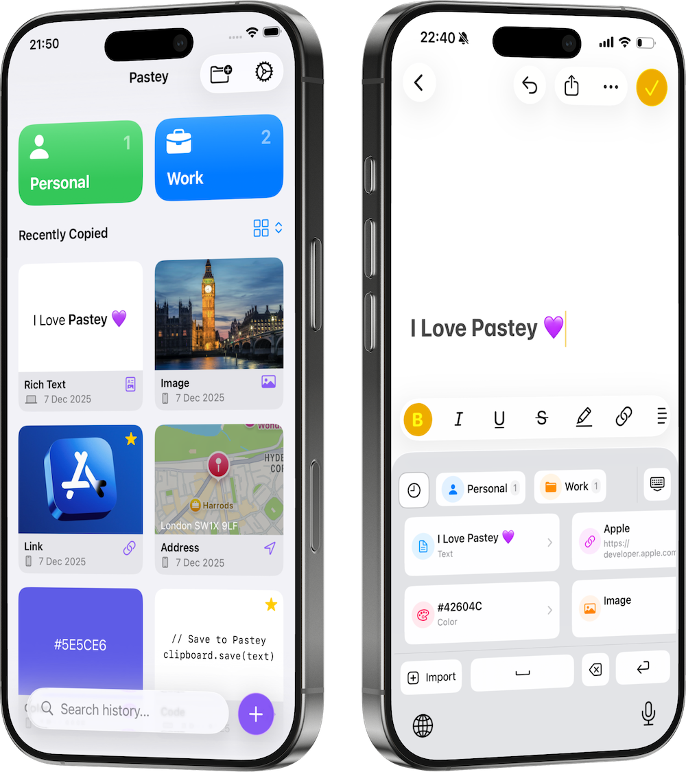 Pastey keeps your most important text, links, images, and notes instantly available, whether you’re on your iPhone, typing on your Mac, or working hands-free with Siri. No re-copying. No clutter. Just fast access to what you use most.